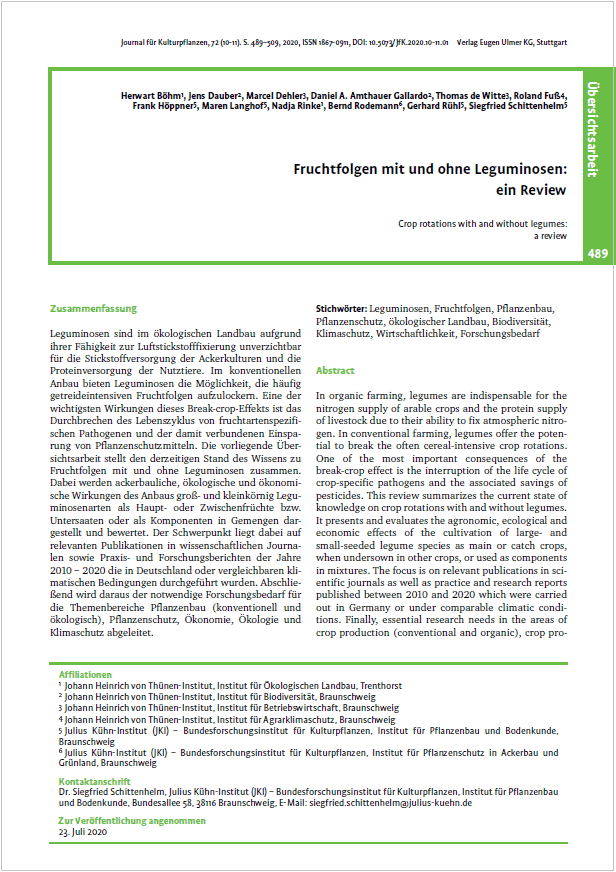 Leguminosen sind im ökologischen Landbau aufgrund ihrer Fähigkeit zur Luftstickstofffixierung unverzichtbar für die Stickstoffversorgung der Ackerkulturen und die Proteinversorgung der Nutztiere. Im konventionellen Anbau bieten Leguminosen die Möglichkeit, die häufig getreideintensiven Fruchtfolgen aufzulockern. Eine der wichtigsten Wirkungen dieses Break-cr...