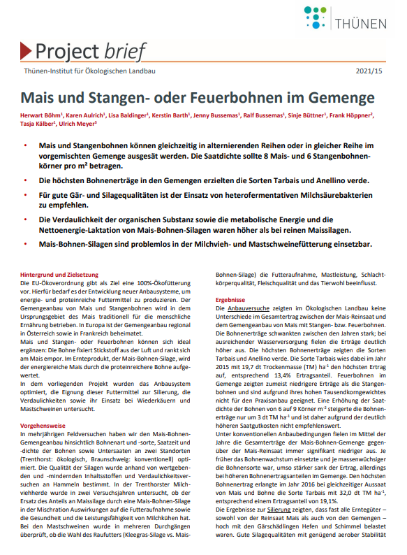 Die EU-Ökoverordnung gibt als Ziel eine 100%-Ökofütterung vor. Hierfür bedarf es der Entwicklung neuer Anbausysteme, um energie- und proteinreiche Futtermittel zu produzieren. Der Gemengeanbau von Mais und Stangenbohnen wird in dem Ursprungsgebiet des Mais traditionell für die menschliche Ernährung betrieben. In Europa ist der Gemengeanbau regional in ...