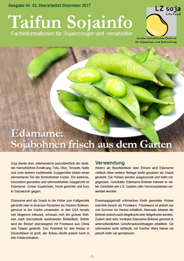 Soja diente über Jahrhunderte ausschließlich der direkten menschlichen Ernährung. Tofu, Miso, Tempeh, Natto und viele weitere traditionelle Sojagerichte bilden einen elementaren Teil der fernöstlichen Küche. Ein weiteres, besonders gesundes und schmackhaftes Sojagericht ist Edamame: Grüne Sojahülsen, frisch geerntet und kurz in Salzwasser gegart. Edamame wir...