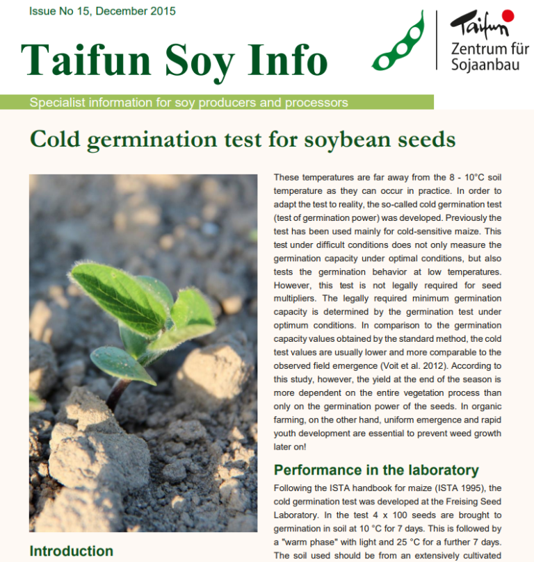In dieser Taifun Sojainfo wird der Einweichtest für Soja-Saatgut beschrieben. Er ist ein interessantes Mittel, um vor Ort rasch und mit geringem Aufwand die Eignung von Geräten und Geräte-Einstellungen zur Aufbereitung von Sojabohnen zu überprüfen. Es ist zu hoffen, dass der Test sich bei den heimischen Soja-Saatguterzeugern und Produzenten von Qualitätssoja...