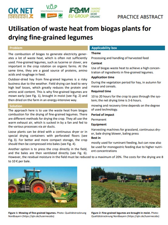 Bei der Verbrennung von Biogas zur Stromerzeugung entsteht viel Abwärme, die oft nicht ausreichend genutzt wird. Feinkörnige Leguminosen, wie Luzerne oder Klee, sind in der Fruchtfolge auf Biobetrieben wichtig. Gleichzeitig sind sie eine gute Quelle für Proteine und Rohfaser im Futter. Der Ansatz besteht darin, die Abwärme aus der Biogasverbrennung f...
