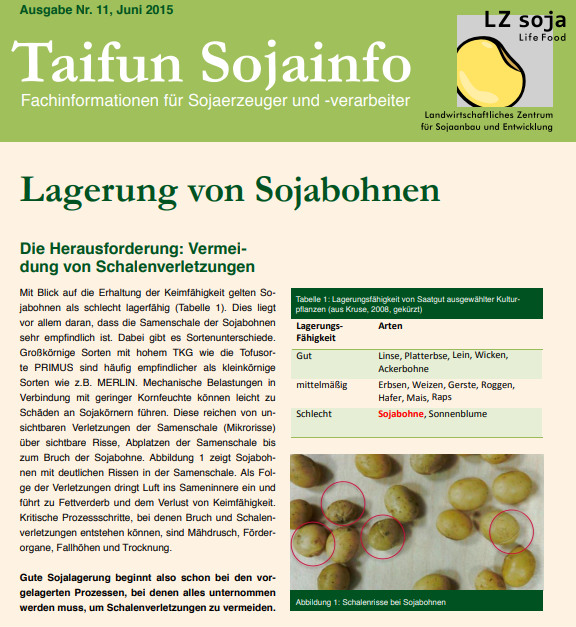 In dieser Taifun Sojainfo beschreibt Taifun Tofu die Herausforderung bei der Lagerung von Sojabohnen: die Vermeidung von Schalenverletzungen. Mit Blick auf die Erhaltung der Keimfähigkeit gelten Sojabohnen als schlecht lagerfähig. Dies liegt vor allem daran, dass die Samenschale der Sojabohnen sehr empfindlich ist. Dabei gibt es Sortenunterschiede. Großk...