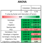 Methods For this investigation, the seeds were obtained from field experiments conducted at INRAE Auzeville, southwestern France for SOJAMIP project. Two sowing modalities (conventional and early or late sowing) and two hydric modalities (rainfed and irrigated) were used to cultivate two early cultivars (Shouna and Sultana, 000 maturity group) and two late cultivars (Ecudor and Isidor, II and I maturity group) in 2017 and 2018. There were 4 plots in the experiment. On the cotyledons and embryo axis, the isoflavone content (mg aglycone equivalent per gram of dry mass) of each sample was determined by HPLC. ANOVA was used to statistically test the impact of the experimental setup. Stress scores by day, 3 for temperature (degree day, low and high temperature), and 2 for water (stomatal and turgor stress), were calculated using the STICS growth crop model7. These scores were averaged across four phenological periods : the vegetative period from sowing to R1, the flowering period from R1 to R5, the pod development from R5 to R6, and the maturation phase from R6 to harvest. Isoflavone content variability in cotyledons and embryonic axis was predicted by PLS regression of these ecoclimatic indicators and genotypes.