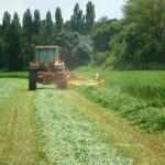 Once established, similar to perennial ryegrass, lucerne can be cut a number of times through the growing season, generally from May onwards. In a four cut regime (about late May, early July, mid-August, and October), the first two cuts together account for about 70% of the annual yield while the last cut accounts for only about 10%. October harvesting reduces the root reserves for over-wintering. The decision to harvest in October is critical for allowing the plant to build up root reserves for the winter. Unlike grasses, where the growing point is at the plant base at soil level, lucerne’s growing points are higher up on the stem. Therefore it is important to leave a 7 cm high stubble. In addition to enabling rapid regrowth, this relatively high stubble also aids wilting, drying and crop handling. Avoiding loss of the leaf material is a priority in crop handling because the leaves account for up to 70% of protein. About 90% of the vitamins and minerals are stored in the leaves. Turning and swathing should be done when the crop is damp, for example early in the morning.