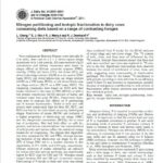 Nine multiparous Holstein-Friesian cows (initially 97 d in milk), were used in a. 3 x 3 lattice square design experiment with 4-wk periods. All cows received 4 kg/d concentrates and dietary treatments were based on silages offered ad libitum: perennial ryegrass (PRO); timothy (TIM); tall fescue (TF); red clover (RC); red clover/corn silage mixture [40/60 on a dry matter (DM) basis; RCC]; red clover/whole-crop oat silage mixture (40/60 on a DM basis; RCO); or red clover/whole-crop oat silage mixture (25/75 on a DM basis; ORC). The remaining treatments were based on RCO with feed intake restricted to the level of PRG (RCOr) or with a low protein concentrate (50/50 mixture of barley and molassed sugar beet pulp; RCO1p). Experiment objectives were to evaluate diet effects on N partitioning and N isotopic fractionation. Yields of milk and milk protein were consistently high for diets RC, RCC, and RCO and low for the diets based on poorly ensiled grass silages. Restriction of intake (RCOr) and inclusion of a higher proportion of whole-crop oat silage (ORC) and the low-protein concentrate (RCO1p) led to some loss of production. Diet had little effect on milk fat, protein, and lactose concentrations: low concentrations of milk protein and lactose reflect, the restricted energy intakes for all treatments. The highest diet digestibilities were measured for RC and PRO, whereas increasing inclusion of the whole-crop oat silage (0, 60, and 75% of forage DM) led to a marked decrease in diet digestibility (0.717, 0.624, and 0.574 g/g, respectively). Urinary excretion of purine derivatives, an indicator for rumen microbial protein synthesis, was significantly higher for RCC than for TIM and TF. Nitrogen intake ranged between 359 and 626 g/d (treatment means). Partitioning of N intake to feces and urine was closely related to N intake, although urinary N losses were less than predicted from N intake for the 60/40 mixtures of cereal silage and red clover silage. The N-15 content of milk, urine, and feces were all influenced by diet N-15 content. Isotopic fractionation meant that feces and milk were enriched and urine was depleted in N-15 relative to the diet. Significant relationships were observed between the extent of enrichment of urine, feces, and milk, suggesting some commonality in fractionation pathways. The trend for the lowest N-15 enrichment in milk protein occurring in diets with low N-use efficiency (milk N/feed N) was contrary to expectations, possibly because of endogenous contributions to milk protein or fractionation when dietary ammonia was incorporated into microbial protein.