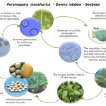 Resting spores survive from over-winter on leaf debris. They are also carried on seed. In most situations where soybean is rotated with other crops, the main infection route is infected seeds. An infected seed results in systemic infection of the whole plant causing stunting and mottling of the leaves. Symptoms are evident at all growth stages. Spores spread by wind in the growing crop. Initial disease development is favoured by a combination of frequent rainfall, heavy morning dew, high relative humidity, and moderate temperatures of 18–22°C. If this phase is followed by a prolonged dry spell, the infection risk is further increasing.