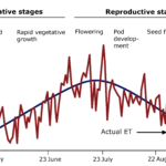 Soybean uses water efficiently. Depending on weather and soil, it uses 400–700 mm water as rainfall, irrigation or from soil to form a yield of 3 tonnes/ha. Soybean uses 1,300 to 2,300 tonnes of water per tonne of soybean produced. This is comparable with sunflower and lower than rapeseed. The rate of water use changes as the crop develops. Soybean seeds absorb about 50% of their weight in water when germinating, so moisture in the upper soil layers is essential. Rolling a freshly sown field under dry conditions helps to improve seed-soil contact and the supply of soil water to the seed. The crop needs about 1.2–2.5 mm of water per day during emergence and seedling development. The water moves from the soil to the atmosphere through evaporation from the soil surface and transpiration from the crop canopy. The rate of evapotranspiration depends on the crop canopy’s response to solar radiation, air temperature, relative humidity, and wind. Water usage increases as the canopy develops to about 2.5–5.0 mm per day. The vegetative stages are less sensitive to water shortages than later reproductive growth stages because the crop loses the capacity to compensate for short periods of stress as the crop progresses (Figure 1).