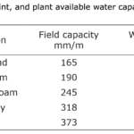 Soybean roots can reach 1.5–1.8 m into the soil and use moisture efficiently in well-drained soils without compaction. Soil properties have a great influence on the availability of soil water for plants. The main soil properties that are important for irrigation management are field capacity (FC) and wilting point (WP). Field capacity is the amount of water held in the soil after excess water has drained away and the rate of downward movement has decreased. Wilting point (WP) is defined as the minimum soil water content required to prevent the plant from wilting. The permanent wilting point (PWP) is the level of soil water below which permanent damage is done and the plant cannot recover its turgor if the supply of water is restored. The texture of the soil strongly affects its water- holding and water-conducting capacity. The need for irrigation may be greater on light sandy soils than on soils with a finer structure with a higher clay content (see Table 1). Loamy sands have less plant-available water comparing with clay soils. But soils of heavier texture also hold on to water and have a higher pool of unavailable water. Soil compaction within 1 m of the surface significantly limits deep penetration of soybean roots. Compaction causes a restriction of the main root growth. The root system develops close to the surface. In such conditions, soybean plants are more susceptible to temporary drought stress and relatively short dry periods.