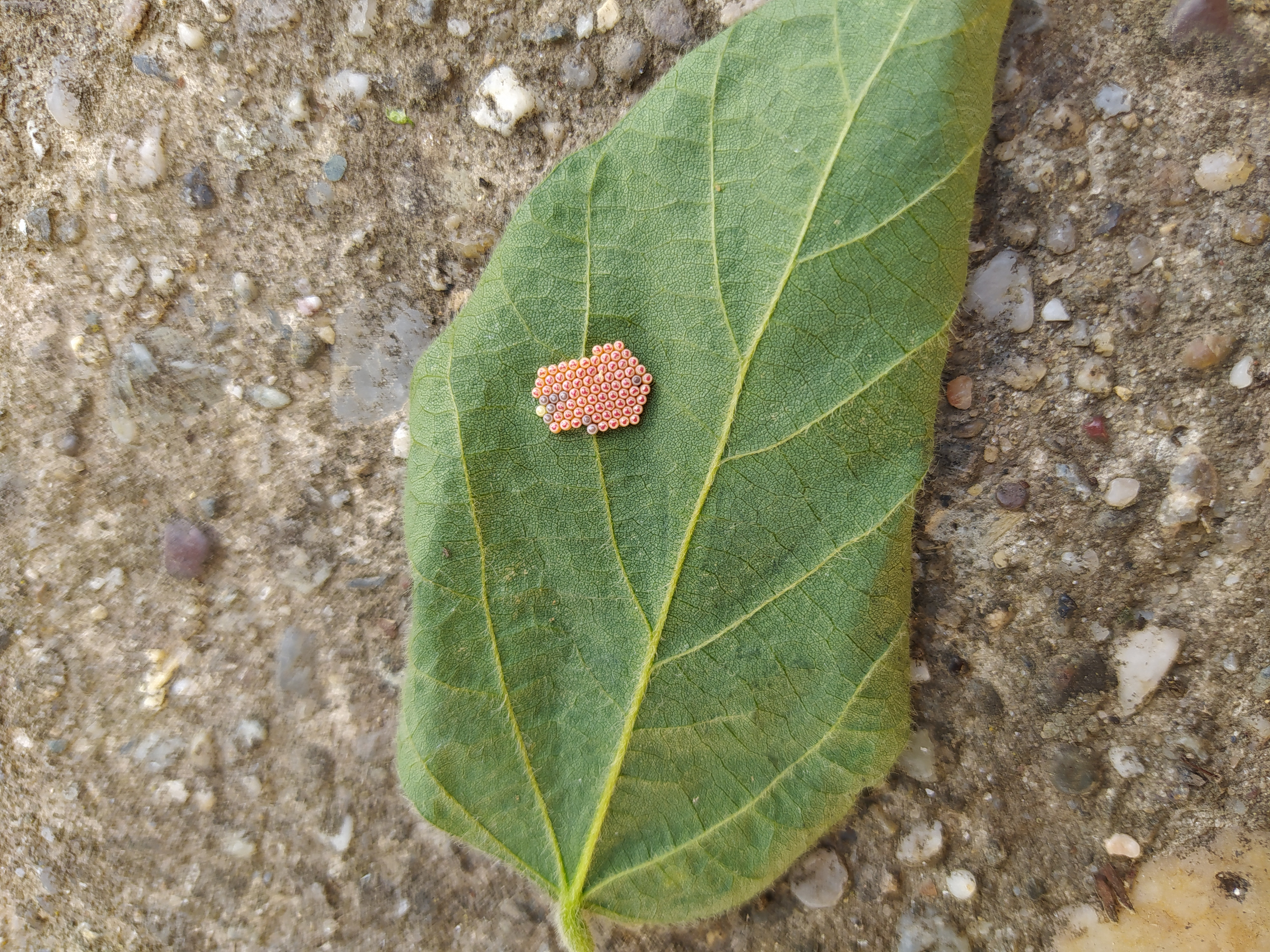 DescriptionLeaf with eggs from green stink bug Chinavia halaris.