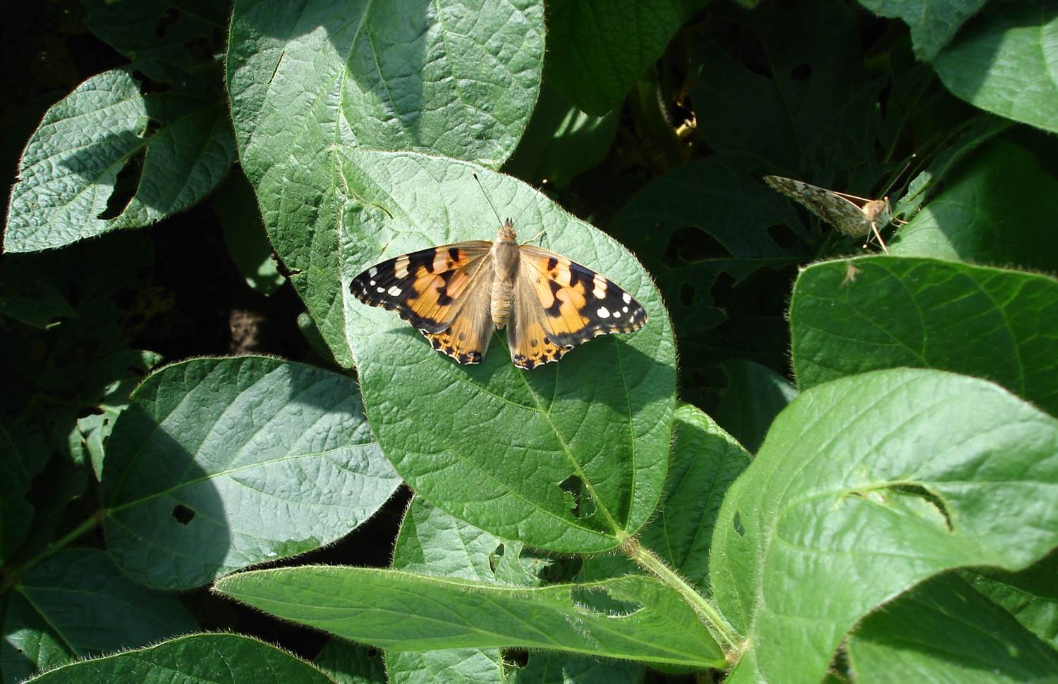 DescriptionPainted lady Vanessa cardui butterfly on soybean.