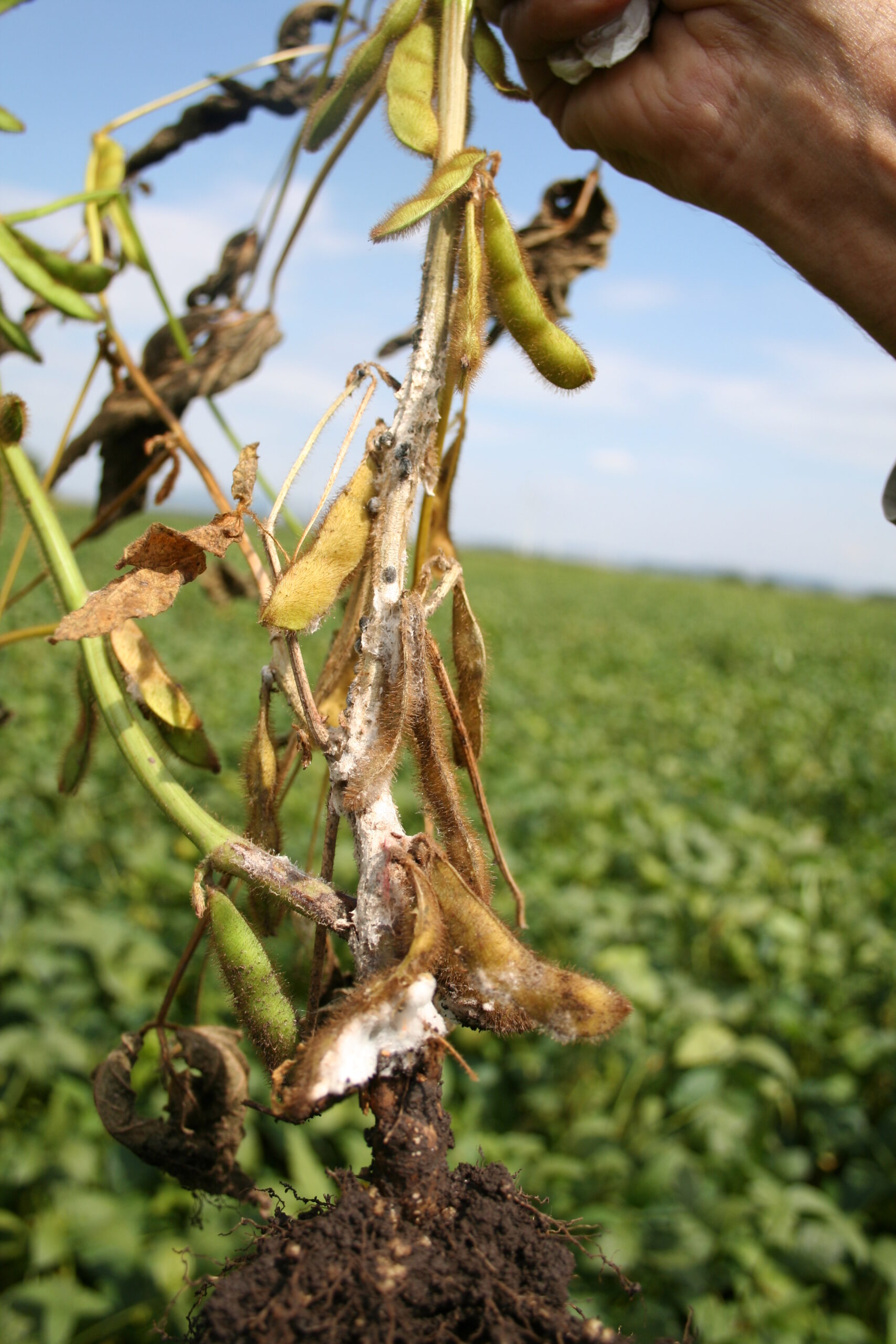 DescriptionSymptoms of soybean with white mold Sclerotinia sclerotiorum showing white mycelium.